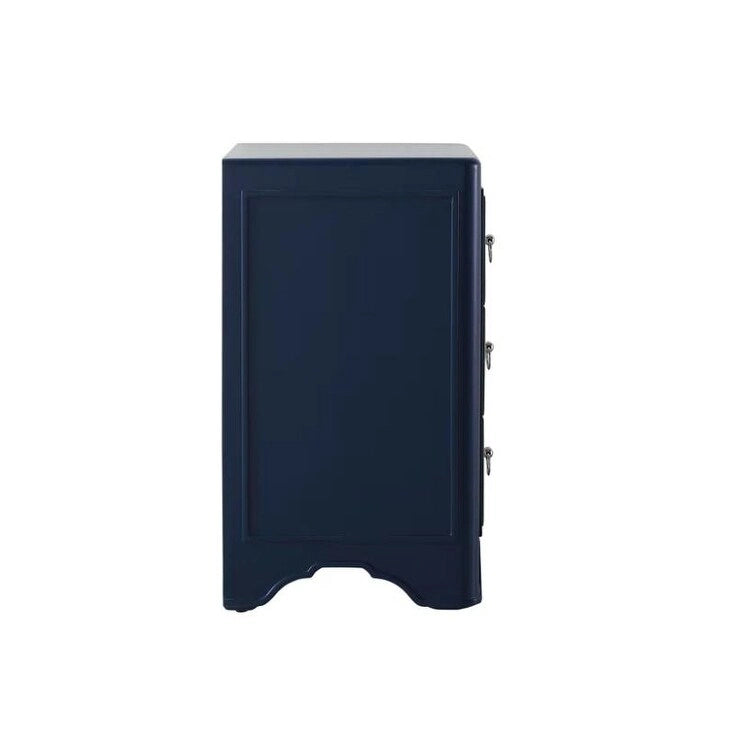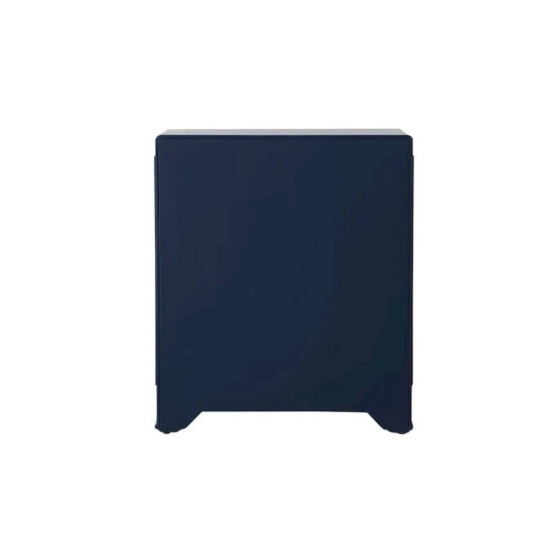 A modern interpretation on a refined mid-century design, a cute side table with midnight blue body, 3 deep drawers with sparkling mirror panels, and beautifully accentuated stainless steel ring knobs. This subtle piece is gracefully trimmed and curves along the cabinet base, the overall effect is one timeless luxury and everyday elegance.