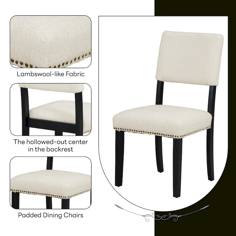 Elevate your dining space with this modern 5-piece dining set, featuring a round 46.5-inch table and four upholstered chairs. Crafted with sturdy pine wood legs and an MDF tabletop with an acacia veneer, the table supports up to 550 lbs. The elegant chairs,made from durable rubberwood, boast plush lambswool-like cushions for a cozy dining experience, blending style and comfort effortlessly.