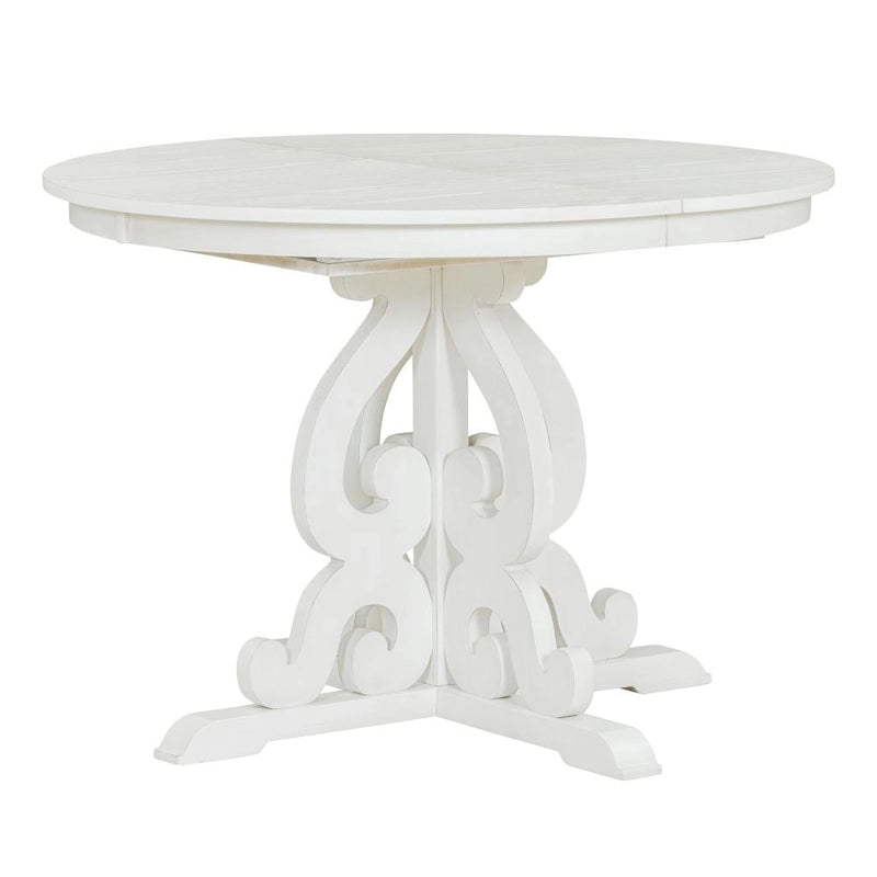 - Retro Style: The retro functional dining set comprises one extendable dining table and four matching upholstered chairs, blending understated elegance with a rich vintage feel. The table legs and backrests of the chairs feature symmetrical hollowed-out carving patterns. Its available in two colors, antique white and walnut. No matter which color dining set you choose, it will be the crowning touch of your restaurant, kitchen or dining room.