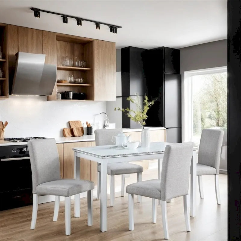 - Pieces Included:1 Dining table+4 Upholstered chairs