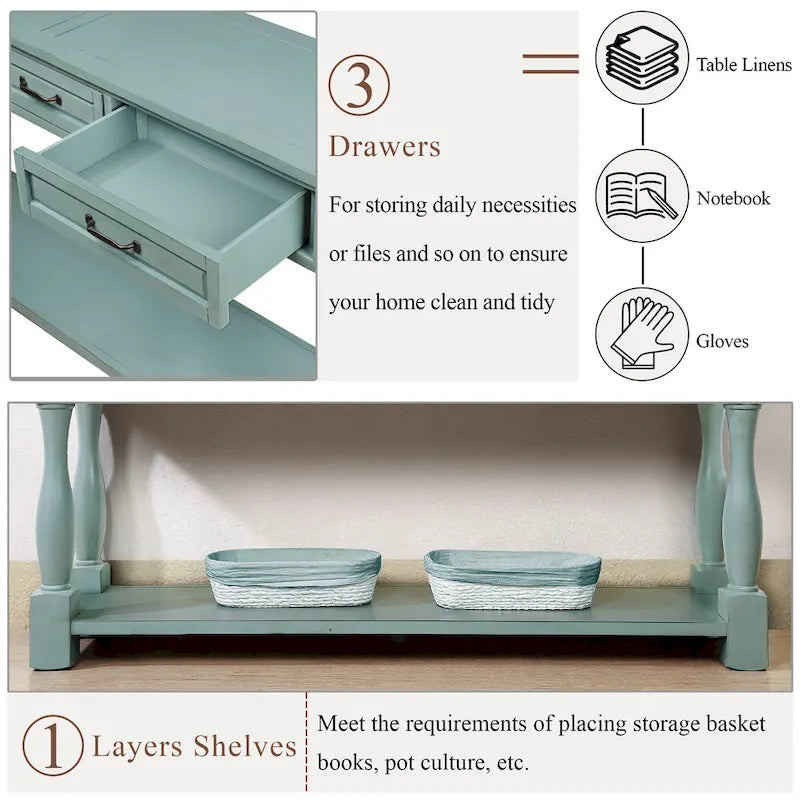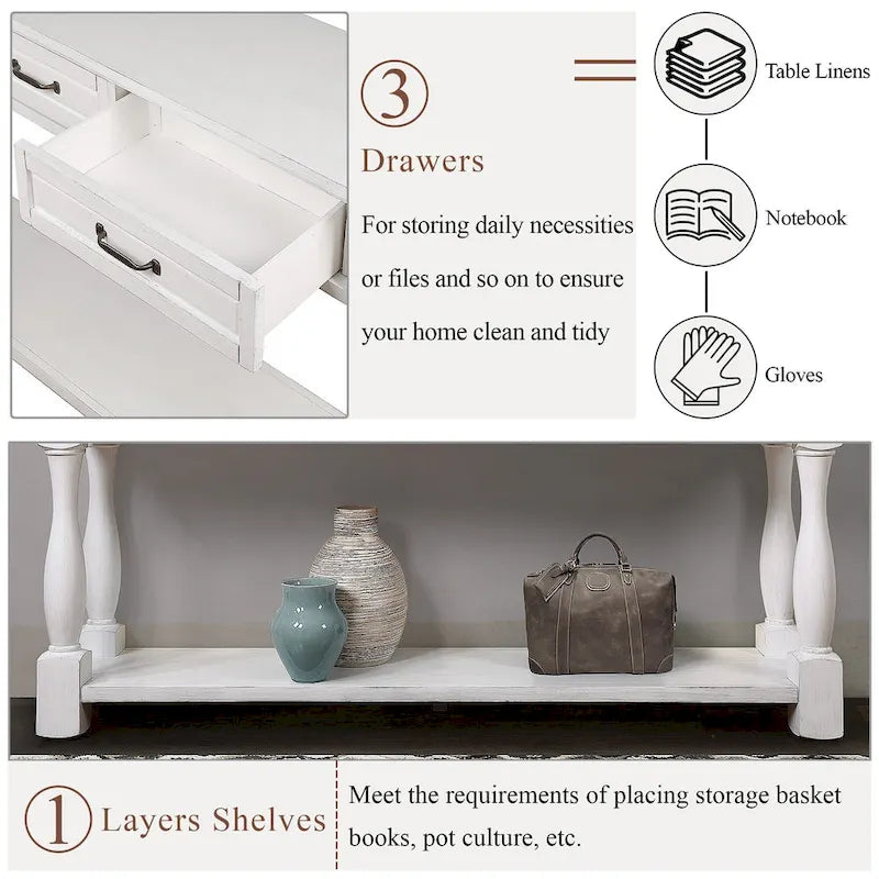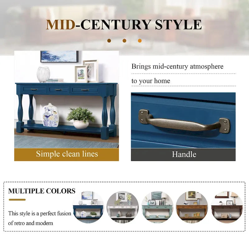 63inch Long Wood Console Table with 3 Drawers and 1 Bottom Shelf for Entryway Hallway Easy Assembly Extra-thick Sofa Table[SOLID WOOD FRAME and LEGS] Solid wood frame and legs, max weight capacity of top:220lbs, durable and sturdy use for years, solid wood frame and legs also make the console table look more valuable. Solid wood and thick legs makes the wood console table more stable. The support leg under the bottom shelf makes the console table more stable[Sufficient Load-Bearing Capacity]: 63L x 14.56W x 30H. Weight -61.73lbs. Top weight capacity - 220lbs, shelf weight capacity - 66lbs, each drawer - 17lbs.[Easy and Fast to Install]- Including all necessary tools and clear instructions, and pieces were labeled perfectly, so you can easy and fast to assemble this sofa console table. Only need to install the four legs and bottom shelf.[American Design & Mid-Century Style]: This style is a perfect fusion of retro and modern. The whole table and metal handle are both aim to bring mid-century atmosphere to your home.[Multi Functional Storage Space] The sofa table features with total 3 functional drawers and a fixed lower shelf and long enough tabletop which provide enough storage space. This is a good place to put your daily necessities.Drawers and Bottom ShelfThree Drawers and one bottom shelf are for storing daily necessities or files and so on to ensure your home clean and tidySolid Wood Frame and Legssolid wood leg guarantee the stability and durability and high quality tabletop ensures the smooth touch feeling.Mid-Century Stylethe whole console table and all details including handle and finish are aim to bring mid-century style to your home.Sufficient Load-Bearing CapacityTabletop can bear max 220lbs; each drawer bears max 17lbs; Open shelf can bear max 66lbsDimensions & WeightProduct Dimensions & Weight:63.38x14.56x30; 61.73LBDrawer Internal Dimension:13.6L x 9.7W x 2.8HWeight Capacity Tabletop: 220 LBS Bottom Shelf: 66 LBS Single Drawer: 17 LBSProduct Name:Console TableMaterial:Pine wood frame and legs+ MDF panelsFinish:PaintingAssembly Required:20minAdditional Tools Required:All tools includedPieces Included :OneNotes1.Manual measurement has been used, there may be some reasonable errort, thanks for your understanding.2.Due to factors such as display equipment and shooting environment, the color of the item may be slightly different from the picture, which is a normal phenomenon, please refer to the actual item3.Improper use of screws may cause the product surface damage! Please be careful when installing.4.It is recommended to put a layer of foam or soft cushion on the floor when installing to avoid scratching the floor.5.If the item has any defects, damage or missing parts, please contact us with pictures or videos so that we can understand your needs and help you quickly, and always remember to retain its original packaging to ensure any return requests. We will try our best to solve any problems you may have.6.If you receive the wrong product, please attach the product picture, the infographic of the outer package and the picture containing SKUs, so that we can verify and quickly deal with it for youCare & Maintance1.Care should be taken when placing hot items directly on the table. 2.Liquids should be immediately blotted with a damp cloth. Do not use surface cleaners that could remove the finish.3.Hardware may loosen over time; periodically check to make sure all connections are tight.