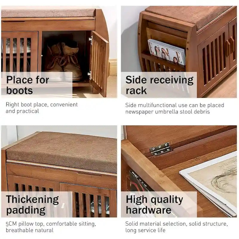 Bamboo Shoe Storage Bench with Storage Space and Padded Seat Cushion, for Entryway, Living Room, Bedroom, Brown