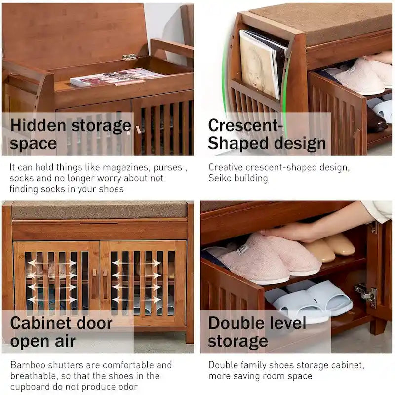 - Detail DisplayThe two side receiving racks have creative crescent-shaped design, where books can be placed. The shoe cabinet is also designed with comfortable door handle,enabling to open the door easily and take shoes quickly. Besides, the top of the shoe cabinet has a thickening padding, and the outer cloth cover can be removed and washed.Whats more, the shoe storage bench with doors adopts the design of bamboo shutters, which is comfortable and breathable, so that the shoes in the cupboard do not produce odor.
