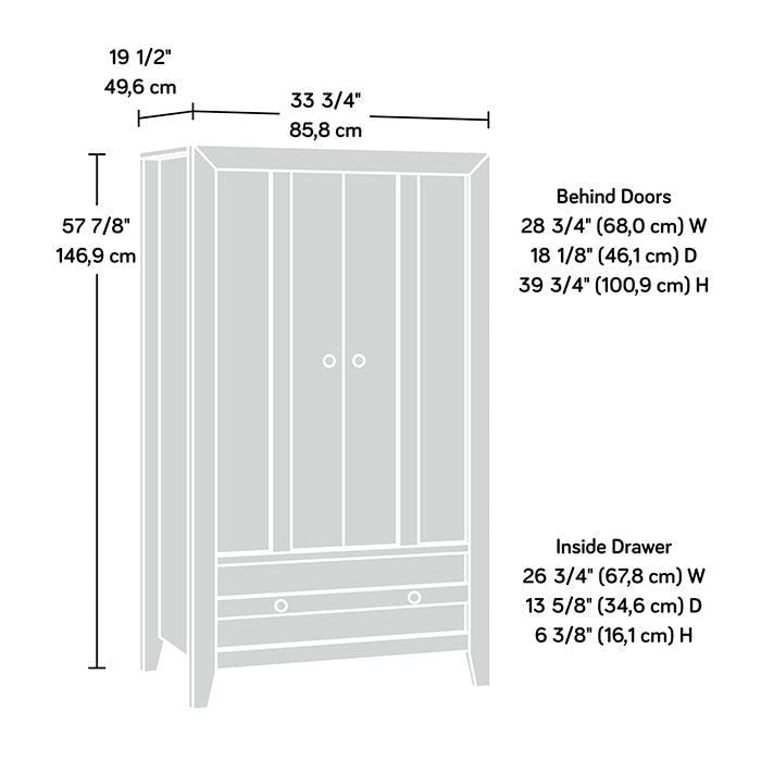 Take a pass on the ordinary. Make a bold statement with this armoire from the Dakota Pass collection. This impressive 2 door armoire cabinet features a large lower drawer with metal runners and safety stops for items like denim, linens, sweaters and more. A garment rod in this wardrobe closet allows for easy hanging storage of items like dresses, button-down shirts, skirts and slacks. Keep your favorite clothes looking interview ready with this clothing storage furniture. An adjustable shelf behind the doors allows for customizable storage options for additional items like shoes, small organizing bins, and more. Traditional rustic country Craftsman Oak finish and details with a contemporary sensibility make this design a favorite accent to nearly anywhere in the house where you need that little extra closet storage. We hope you like what you see with this armoire with drawer. Sauder designers travel the world and bring back the best and latest in style, finish, and color trends. This inspiring world travel is evident in the cutting edge and innovative furniture solutions we offer to you!