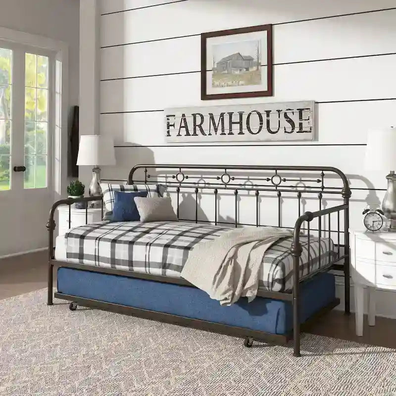 With a classic, timeless design, the iNSPIRE Q Darren Antique Dark Bronze Metal Daybed pairs perfectly with a traditional or farmhouse styled setting. With dainty spindle detailing and decorative metal accenting, this curved metal bed is both simple and beautiful. The antique dark bronze finish of this bed matches well with almost any color or dcor scheme. The optional trundle bed provides additional sleeping spaces for children, teens, and overnight guests.
