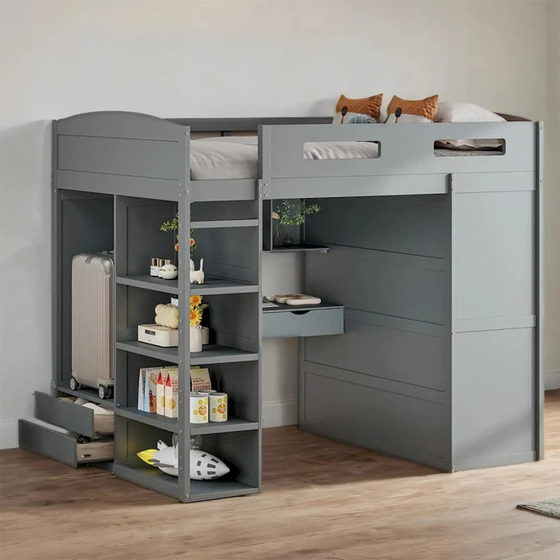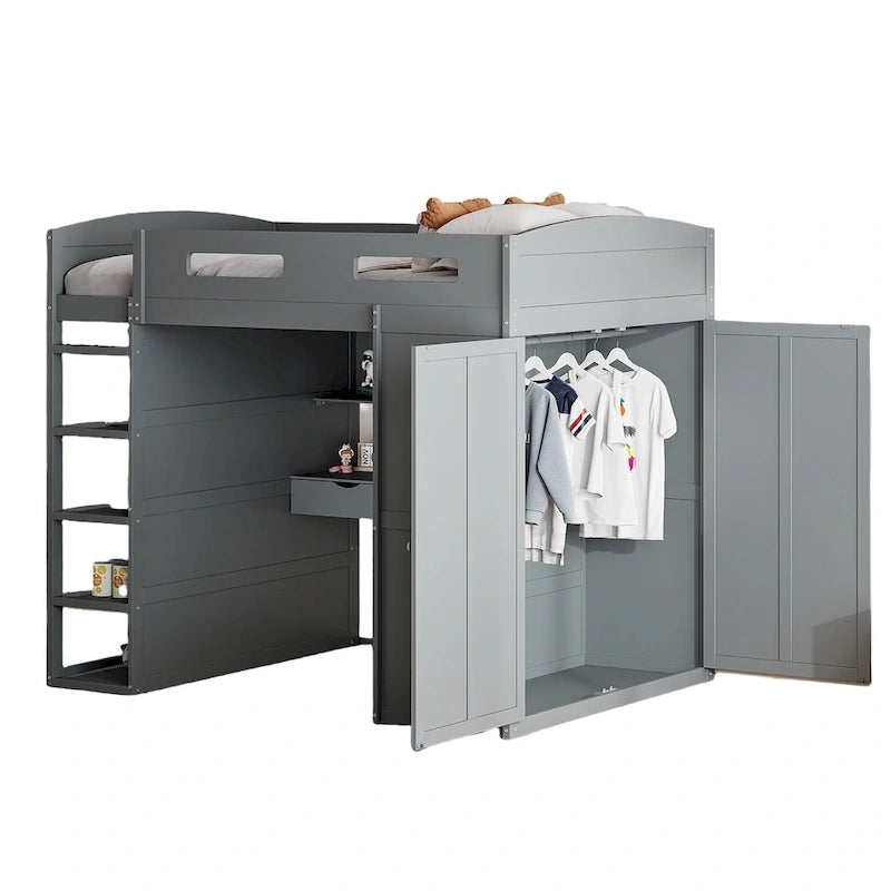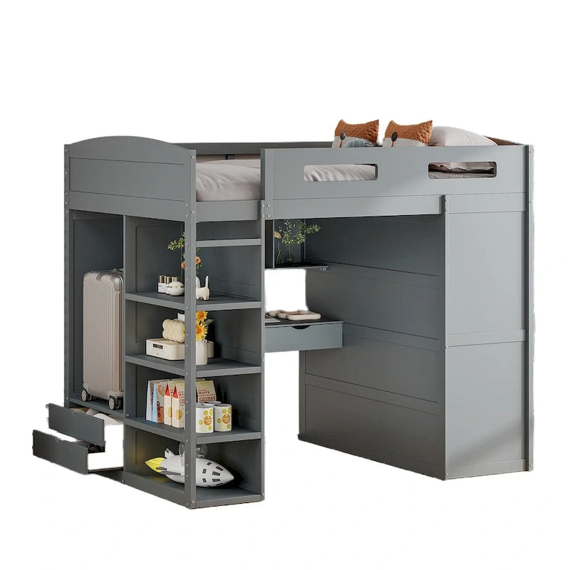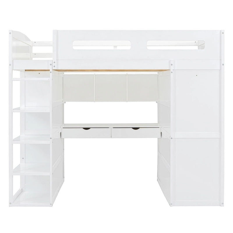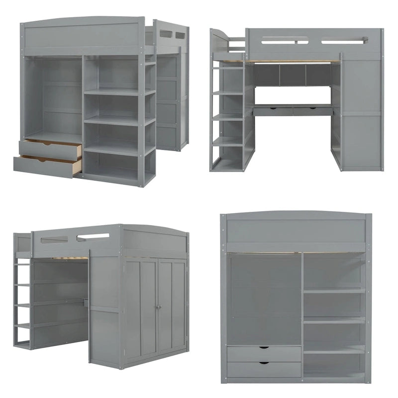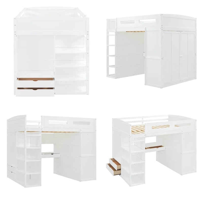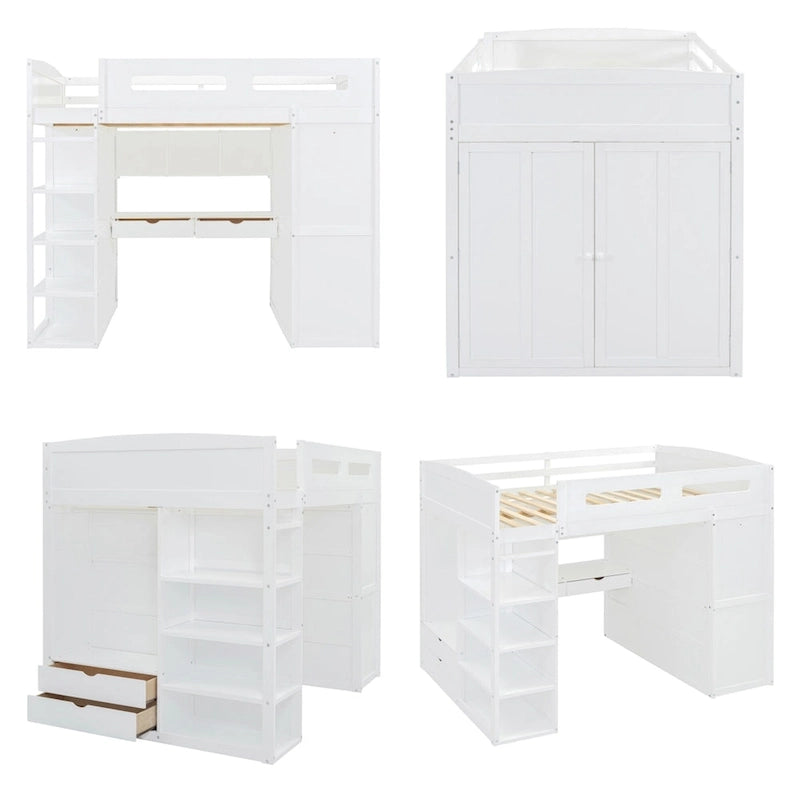Full Size Wood Loft Bed with Desk, Wardrobes,Drawers and Shelves