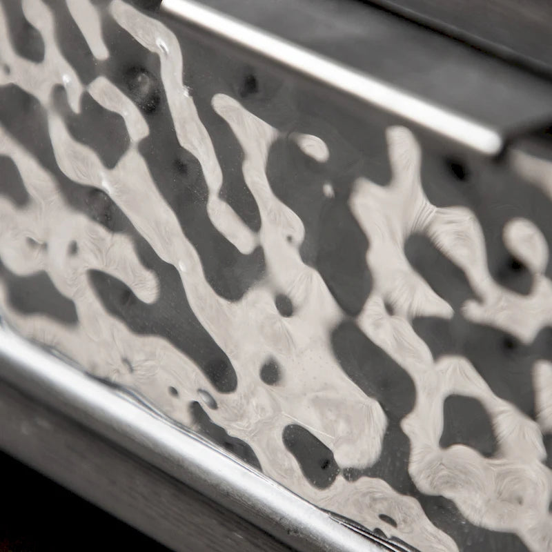 With hammered stainless steel front panels, the sofa table introduces a bold and modern touch to any living area. Its open bottom shelf offers practical space for books, decor, or other essentials, enhancing both style and functionality. Ideal for contemporary settings, this table effortlessly combines sleek design with utility.