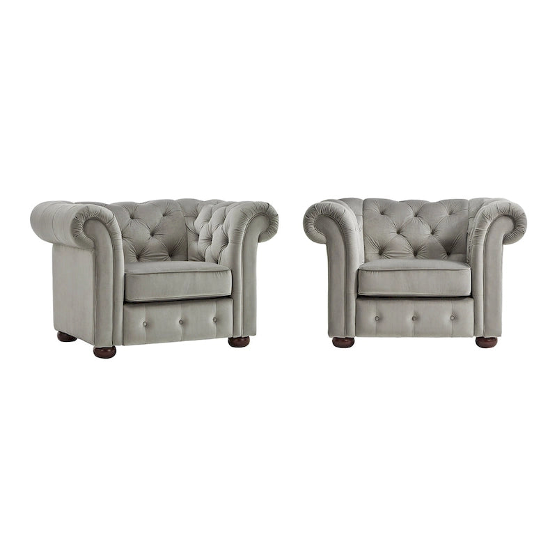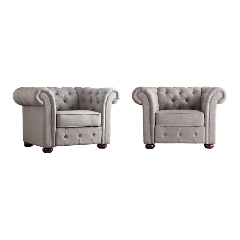 Add a regal accent to your living space with this Tufted Scroll Arm Chesterfield Chair. This beautiful piece has an abundance of elegant details, including espresso-finished bun feet, plush button tufting, and rolled arms and back. Foam cushioning and soft upholstery makes for the perfect spot to curl up in, while the durable wooden construction ensures proper strength and support. Place this lovely chair in any formal or farmhouse-themed setting.