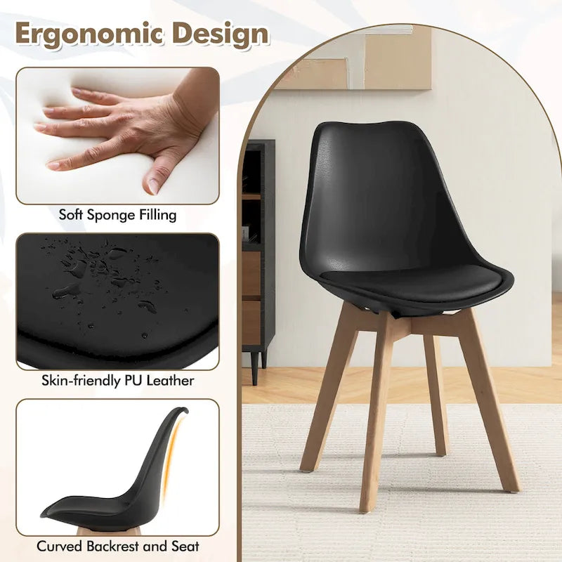 Enjoy Comfortable Dining Time with Your Family and Friends!Our 5-piece dining table set includes a round dining table and 4 padded armless chairs, which are tailored for intimate family meals or friend gatherings. With the combination of a glass tabletop, natural wood legs, and black PU leather, this dining set exudes a sense of contemporary refinement, effortlessly elevating the look of your dining area. Crafted for durability, the table and chairs boasts solid wood legs, ensuring stability and longevity.
