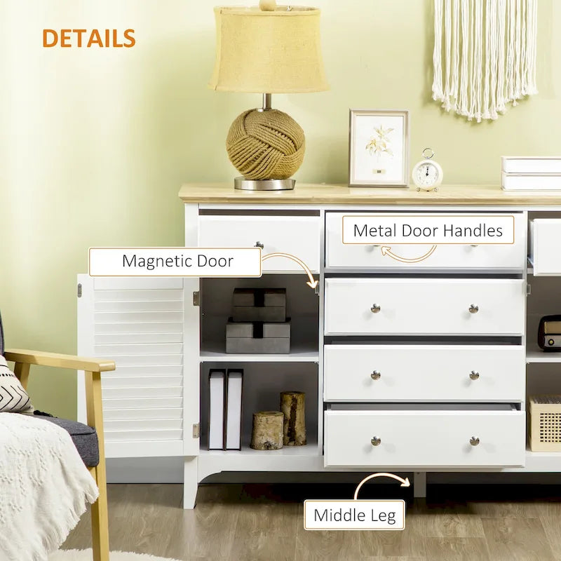 Add style and functionality to any room with this modern HOMCOM sideboard storage cabinet. The versatile buffet cabinet features two storage cabinets and six drawers with adjustable shelves that can accommodate items of various heights. Made of MDF, particle board, and rubberwood for durability, this cabinet is perfect for your kitchen, dining room, living room, or any other limited space requiring additional storage. With its smooth steel rails, zinc alloy handles, and hinges, this cabinet is easy to use and reliable. The painted surface is water-resistant and easy to clean, and the anti-tipping design and middle leg ensure stability. Assembly required.