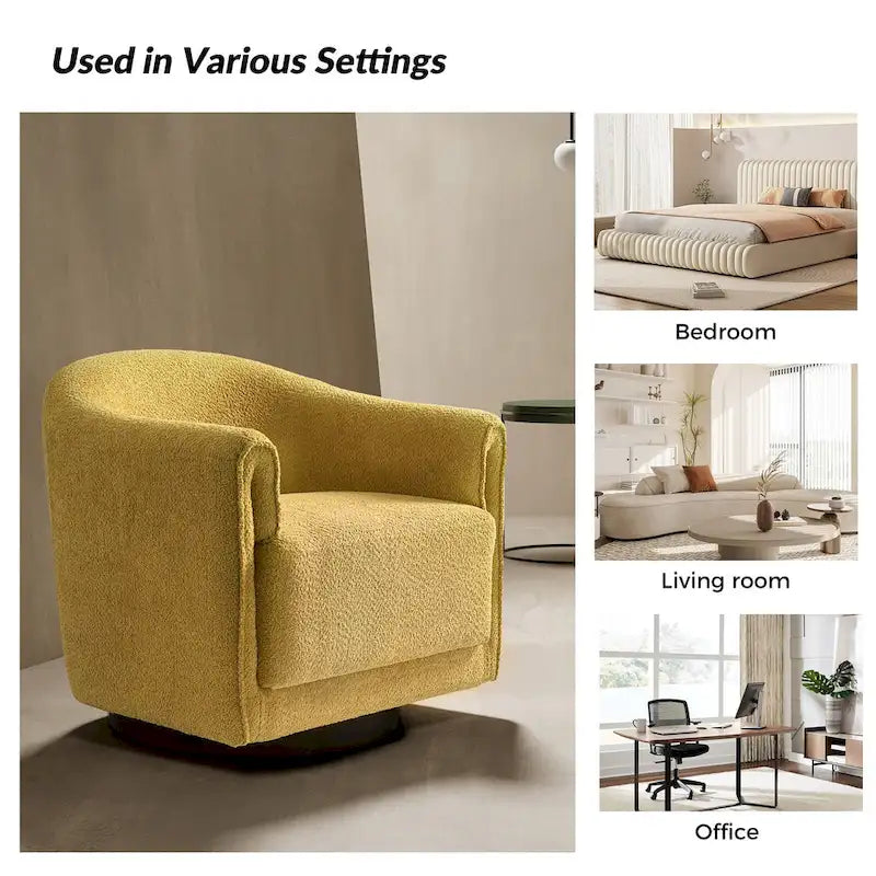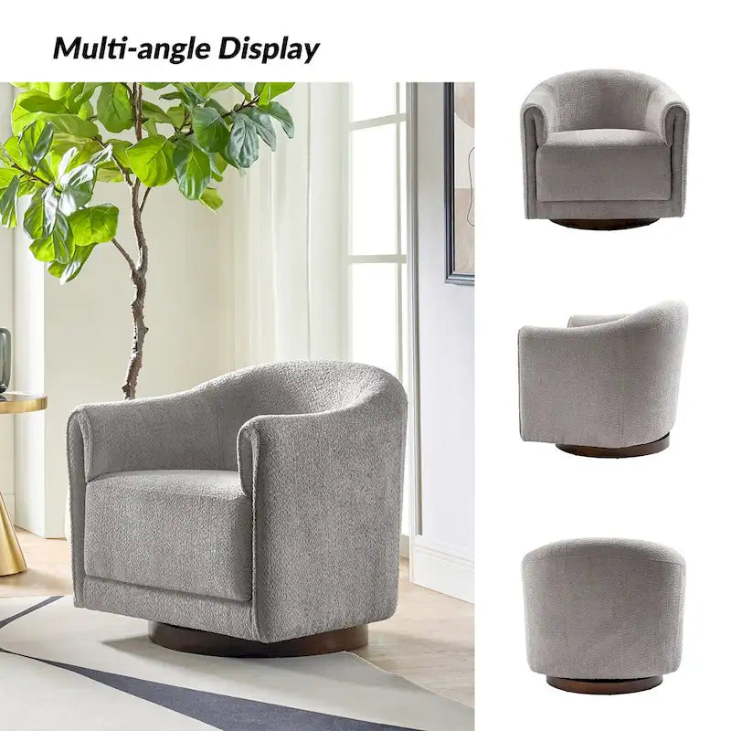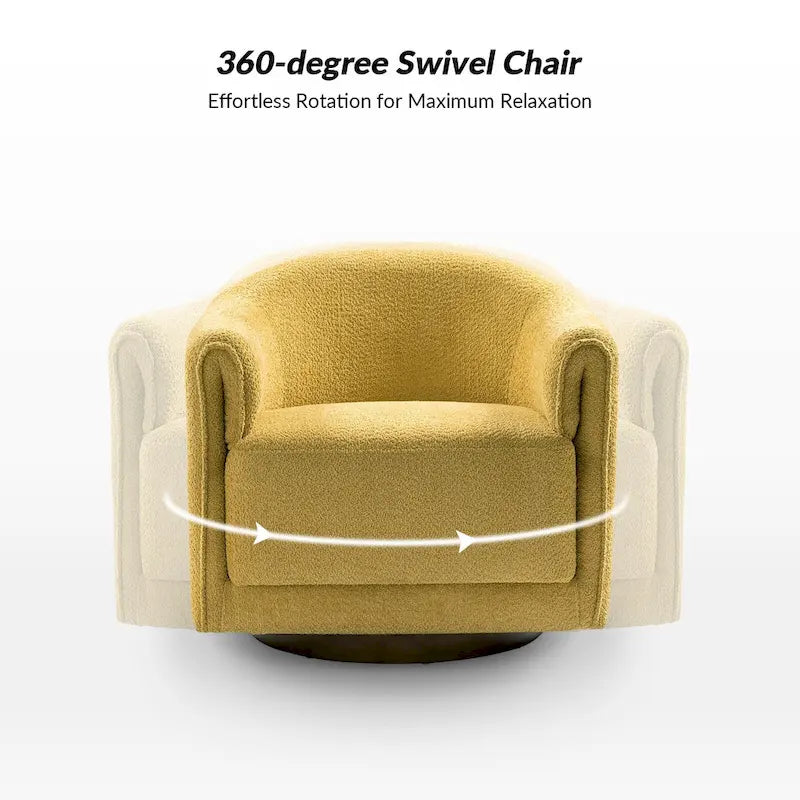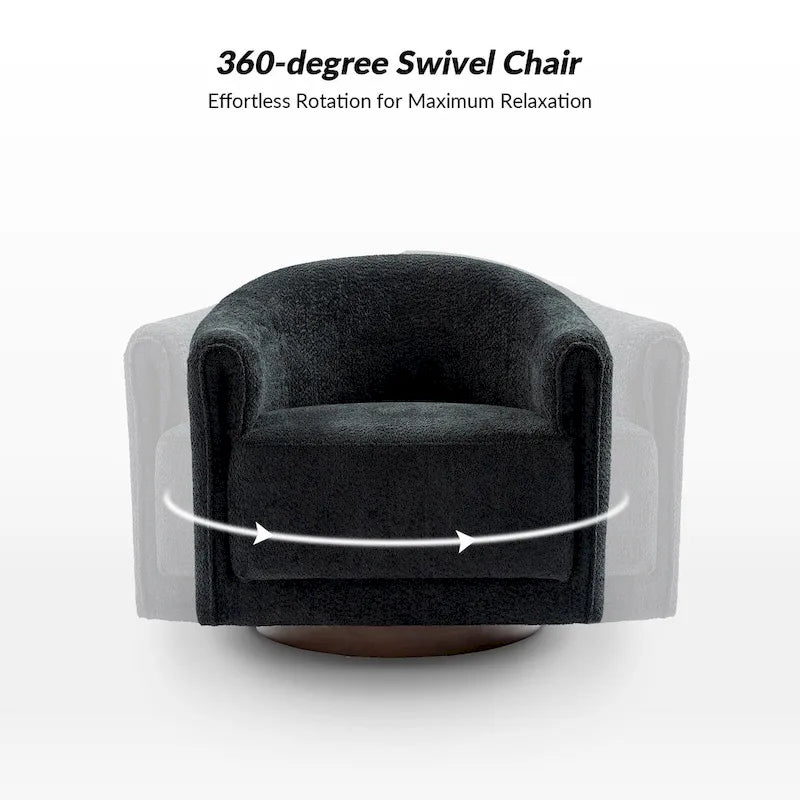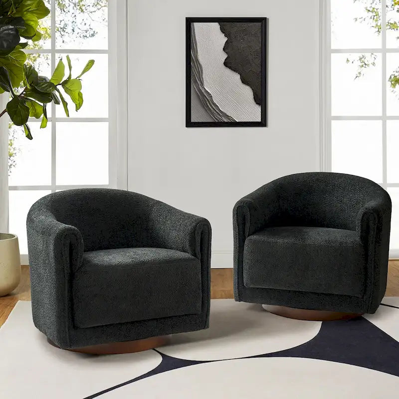 Experience the perfect blend of modern style and functionality with the modern barrel swivel chair set. This chair set is designed to rotate a full 360 degrees, providing you with flexibility and convenience. With its sleek and contemporary design, it seamlessly integrates into any living room decor, be it Italian contemporary, contemporary glam, Ultra modernScandinavian styleclassic Boho styles. Sink into comfort with the thick and wide cushion, offering an enhanced seating experience for relaxation or socializing. The fold-shaped armrest design adds an extra level of comfort, ensuring a cozy and supported feel for your arms. The chair set features a sturdy wood base that not only adds a touch of sophistication but also enhances its overall value. Elevate your living room with this chair set and experience the perfect combination of style, comfort, and convenience.