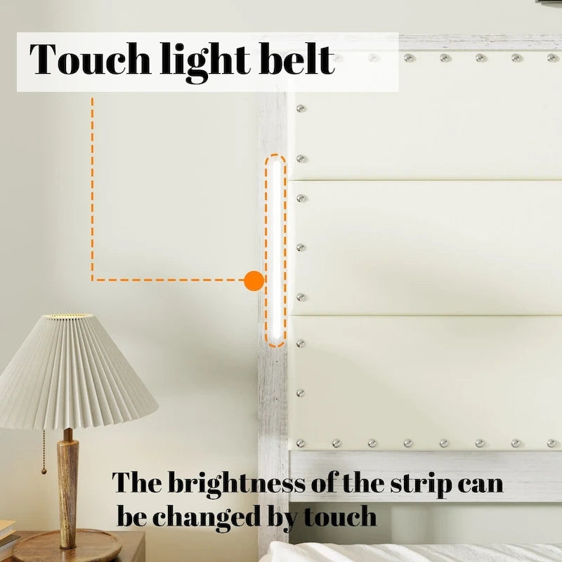 King Bed Frame with Headboard&Charging Station, 4 Drawers, LED Lights, Wood Slats, Faux Leather & Rivets, No Box Spring Needed
