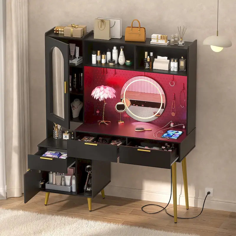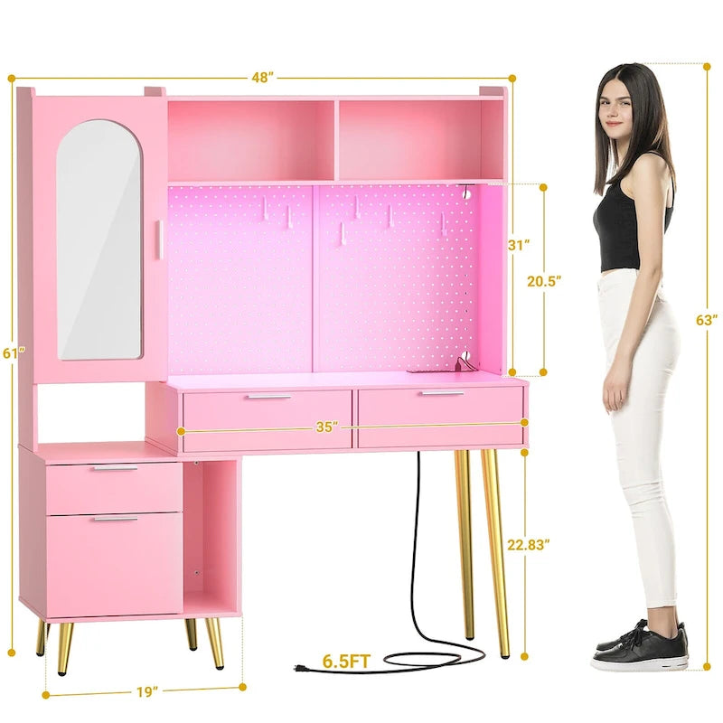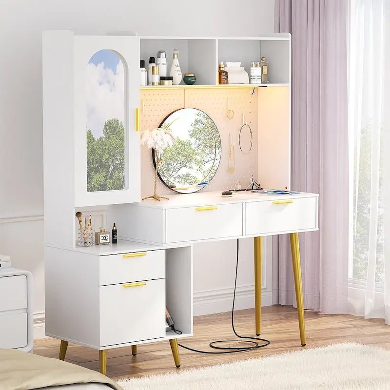 Elevate your beauty routine with our versatile Makeup Vanity, which features a substantial tabletop made from high-quality materials, providing a sturdy foundation. Supported by six sleek metal legs, this desk combines strength with a modern aesthetic, ensuring stability and a contemporary look. Complete with a blend of drawers, cabinets, and shelves, this vanity offers ample storage for all your beauty essentials. Customize your organization with the included DIY pegboard, allowing you to arrange accessories and tools exactly as you prefer. Transform your space into a personal oasis with our Makeup Vanity, where elegance meets practicality for a flawless beauty experience every time.