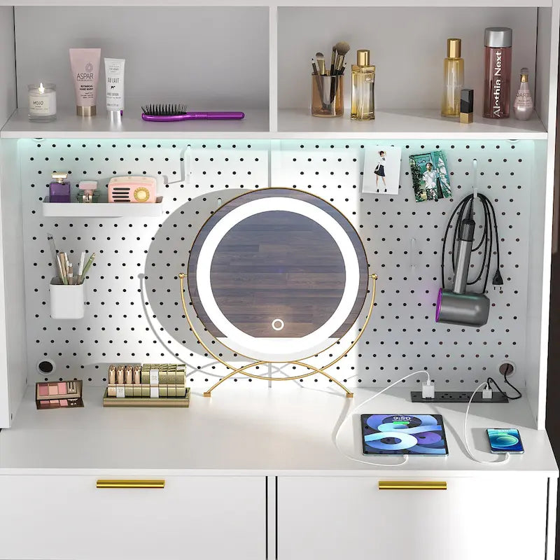 Makeup Vanity with Pegboard and Hutch, Bedroom Vanity Table with Charge Station and LED Light - N/A