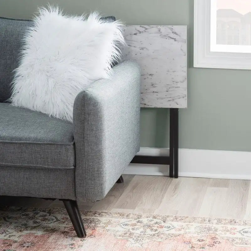 The White Faux Marble TV Tray Set has a distinctive look with its sturdy wood construction and faux white marble top. This five-piece set includes four foldable TV trays and one storage stand. The handle on the top of the black finished stand makes it easy to transport the entire set from one room to another. A classic home furnishing staple that allows surface space for various activities with ease of mobility.
