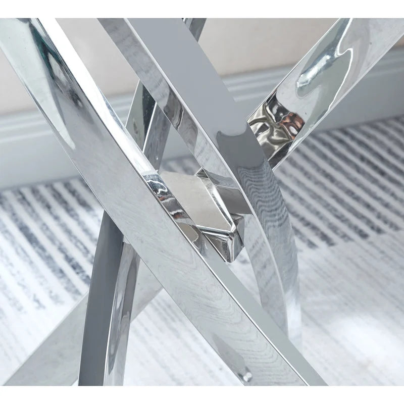 - Anchor your living space in ultracontemporary style with this round glass end table. Crafted of metal in a gleaming finish, this table features a modern, sculptural base composed of four angular, slanted posts. Small leveler feet ensure a balanced, even table, while round supports affix the base to the 0.39 thick clear glass tabletop.