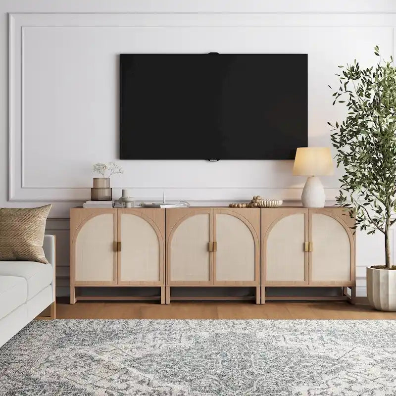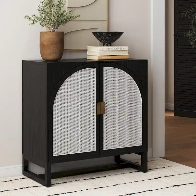 Paxton Boho Wood Storage Cabinet with Doors, Small Storage Cabinet or TV Stand with Rattan Door Details