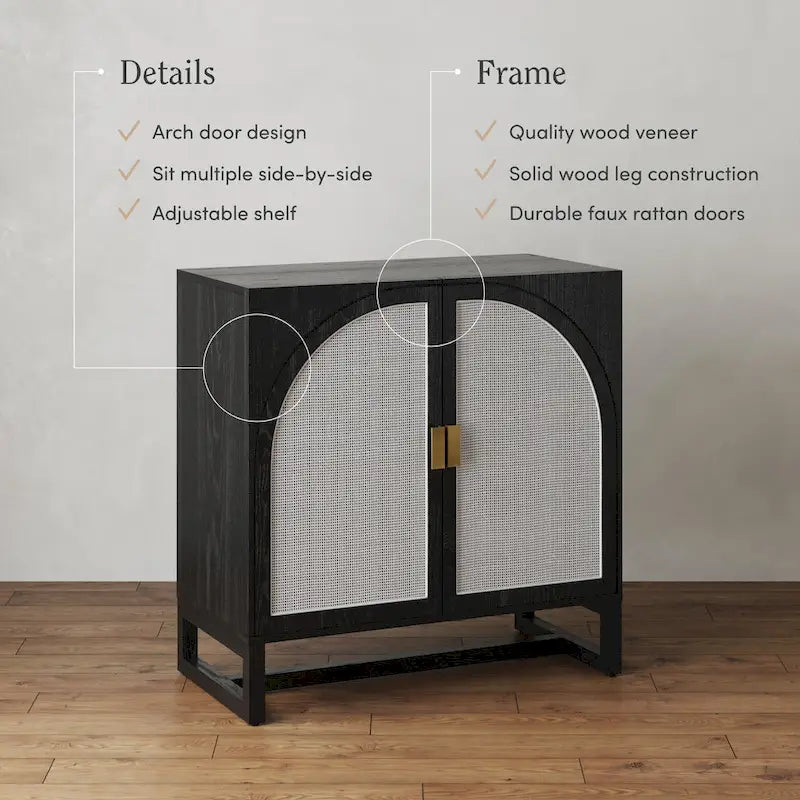 - It features two arched cabinet doors with plastic rattan panelling.