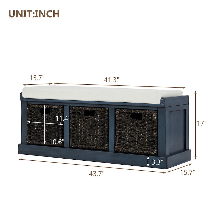 Rustic Storage Bench with 3 Removable Classic Rattan Basket , Entryway Bench with Removable Cushion