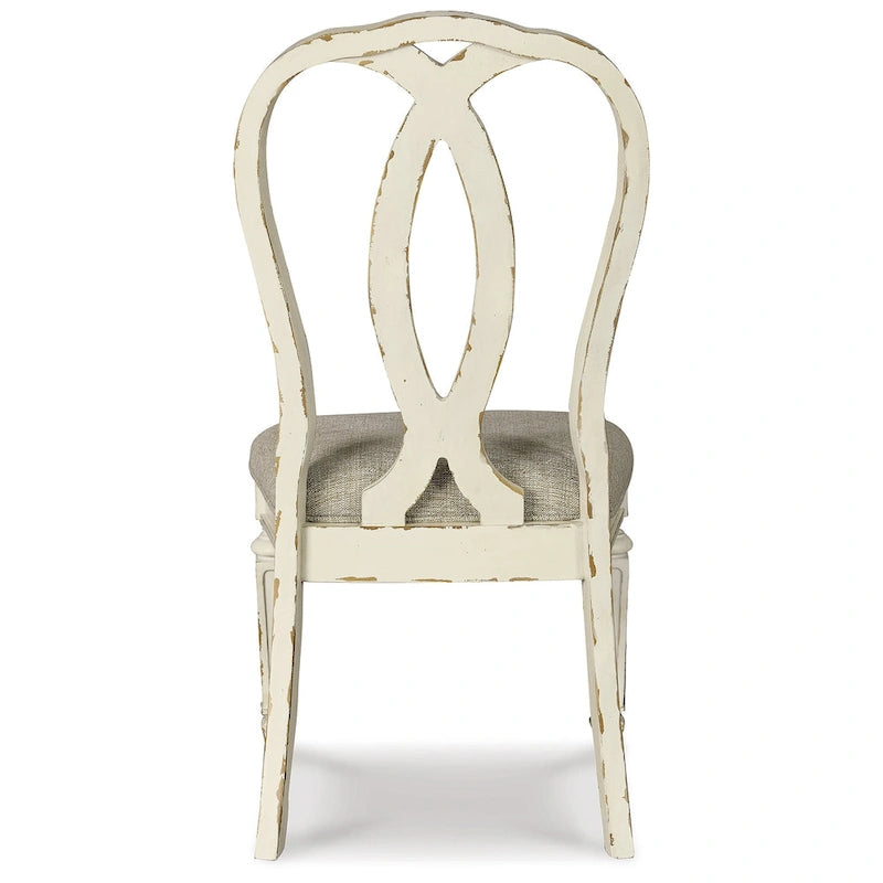 Bon apptit. This dining package has all the right ingredients for a French country-inspired feast for the eyes. Enhance your dining area and serve up a place for casually cool entertaining. Its antiqued two-tone aesthetic pairs a chipped white with distressed wood finished top and for twice the charm. Plushly cushioned seats are covered in textured oatmeal-tone fabric.