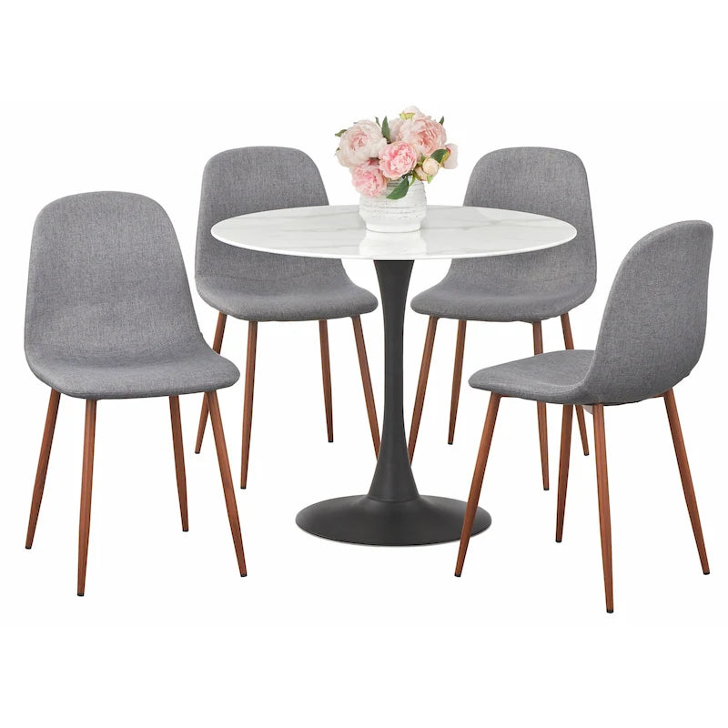The Astrid 5-piece Dining Set by Simple Living adds contemporary flair to your dining space with a unique marble-look top table and scoop back dining chairs. In a contrast of colors and materials, this striking table has a hint of industrial inspiration. The faux marble top is finished with tempered glass for an ultra-strong surface that's also easy to clean. The pedestal base is made from metal and finished in black. Taking inspiration from retro scoop-back chairs, these modern versions incorporate a range of materials to make the look more natural and inviting. Crafted from bentwood, foam and metal, these cushioned chairs are upholstered in your choice of 4 linen-like fabrics: black, beige, grey or dark green.