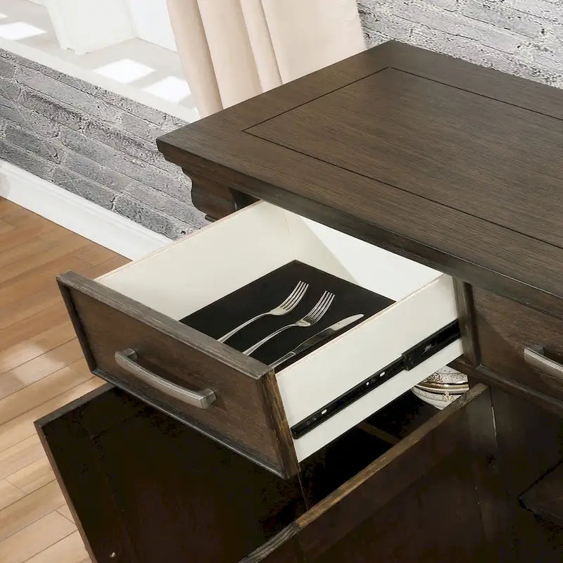 Upgrade your dinner party routine with this transitional-style sideboard buffet for the dining room to hold your essentials. This espresso-finished piece offers an architectural look in your space while offering up convenient and functional storage in the three drawers and three cabinets.