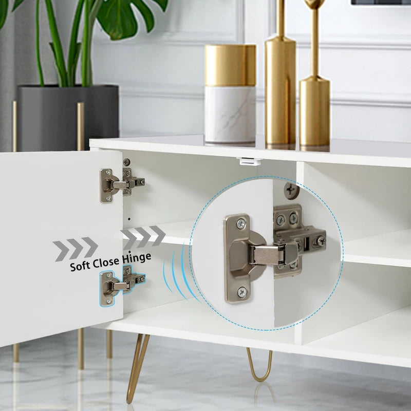 DURABLE ENTERTAINMENT CENTERMade of high quality MDF wood, the TV stand is wear resistant, Added durability with its scratch and water resistance feature. 4 metal legs with a strong load-carrying capacity, ensuring the stable and not easy to wobble. Equipped with soft-close hinge, this TV entertainment center will not pinch or make noise when closed.