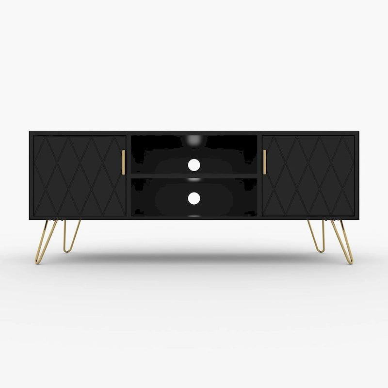 Reinvent your home with a charming, clean-lined modern TV stand with storage; Crafted from manufactured wood with golden metal handles and legs. Two open space with self organizing you stage your DVD player and movie collection. This minimalism-inspired TV console will look great in rooms featuring an eclectic modern tone; concise lines and modern tone will complement your living room. Its perfect size and practical design are ideal for living room, bedroom, office and other places.